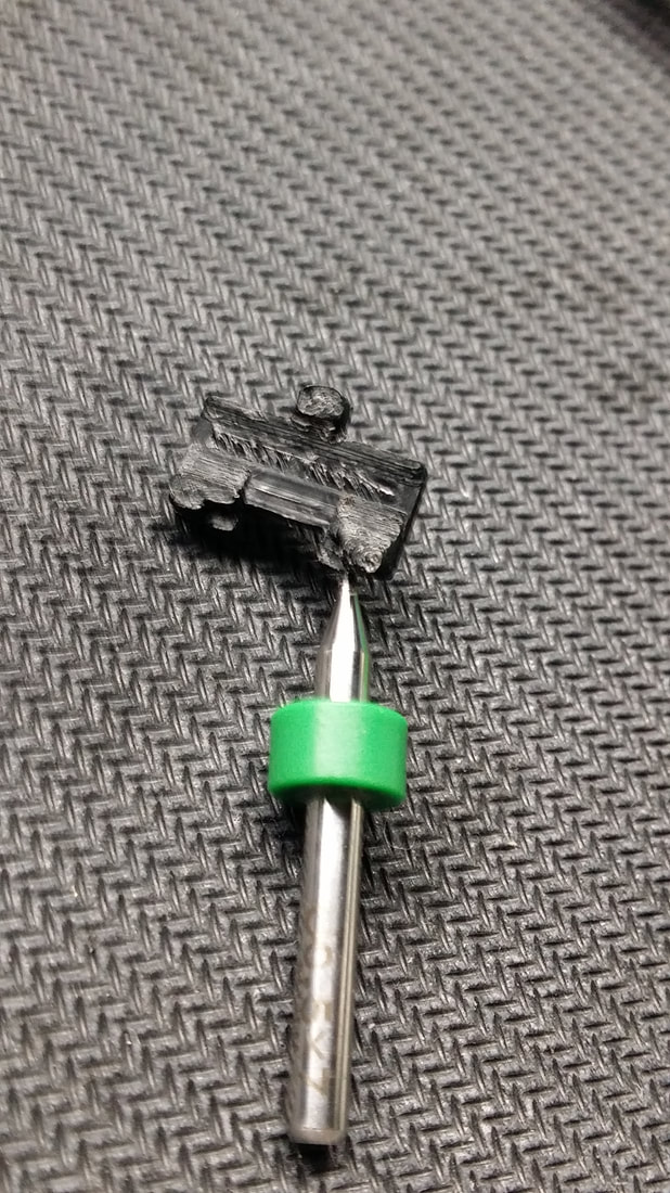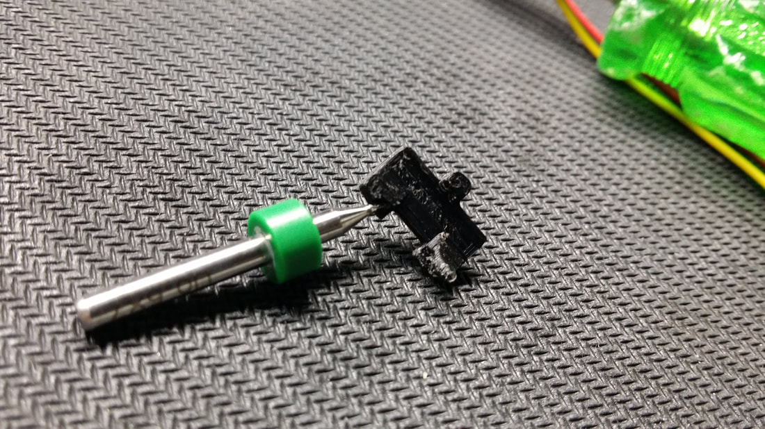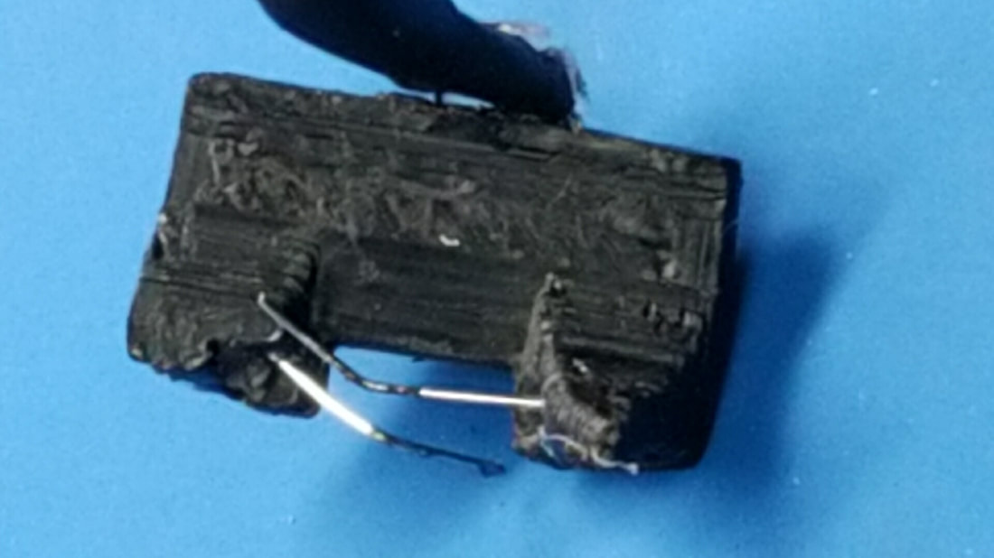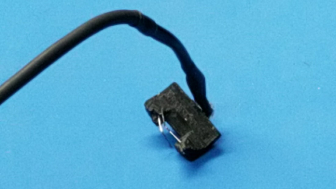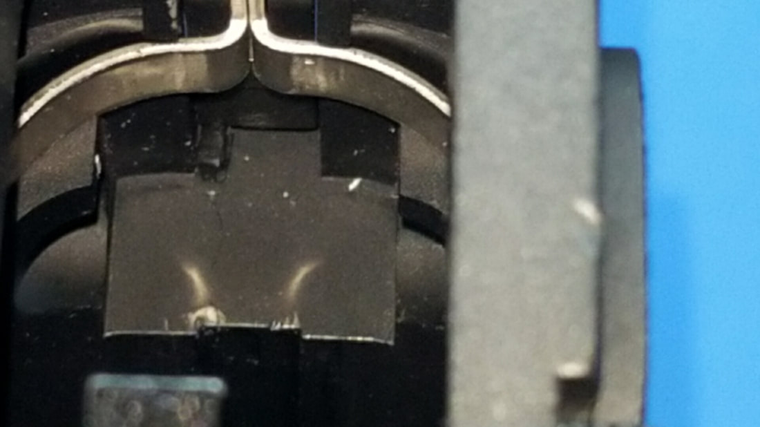 THIS IS OUR TRIGGER SWITCH DESIGN. IT SITS IN THE CAVITY BETWEEN THE TRIGGER AND THE MAGAZINE RELEASE. THE CONTACT WIRES ARE MADE FROM A .016 GUITAR STRING AND ARE HAND TUNED (BENT) TO MAKE CONTACT PRECISELY AT TRIGGER BREAK..