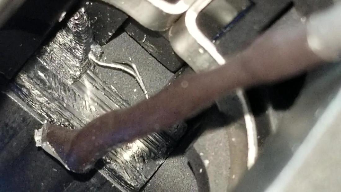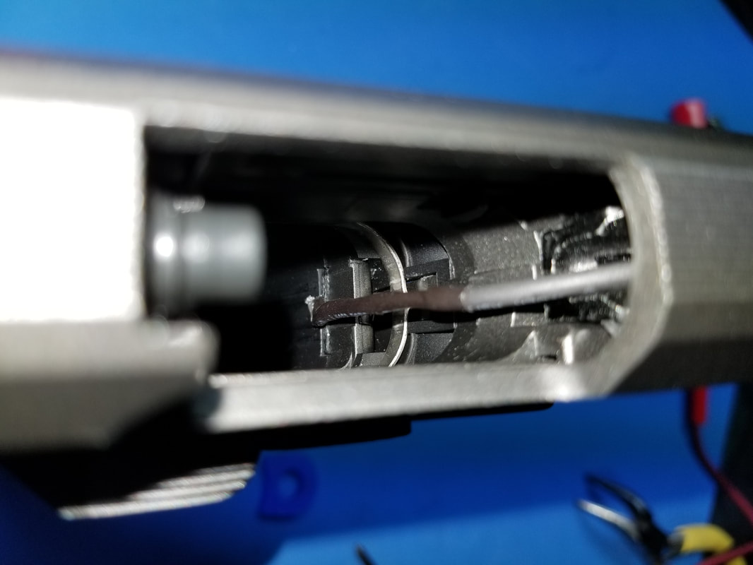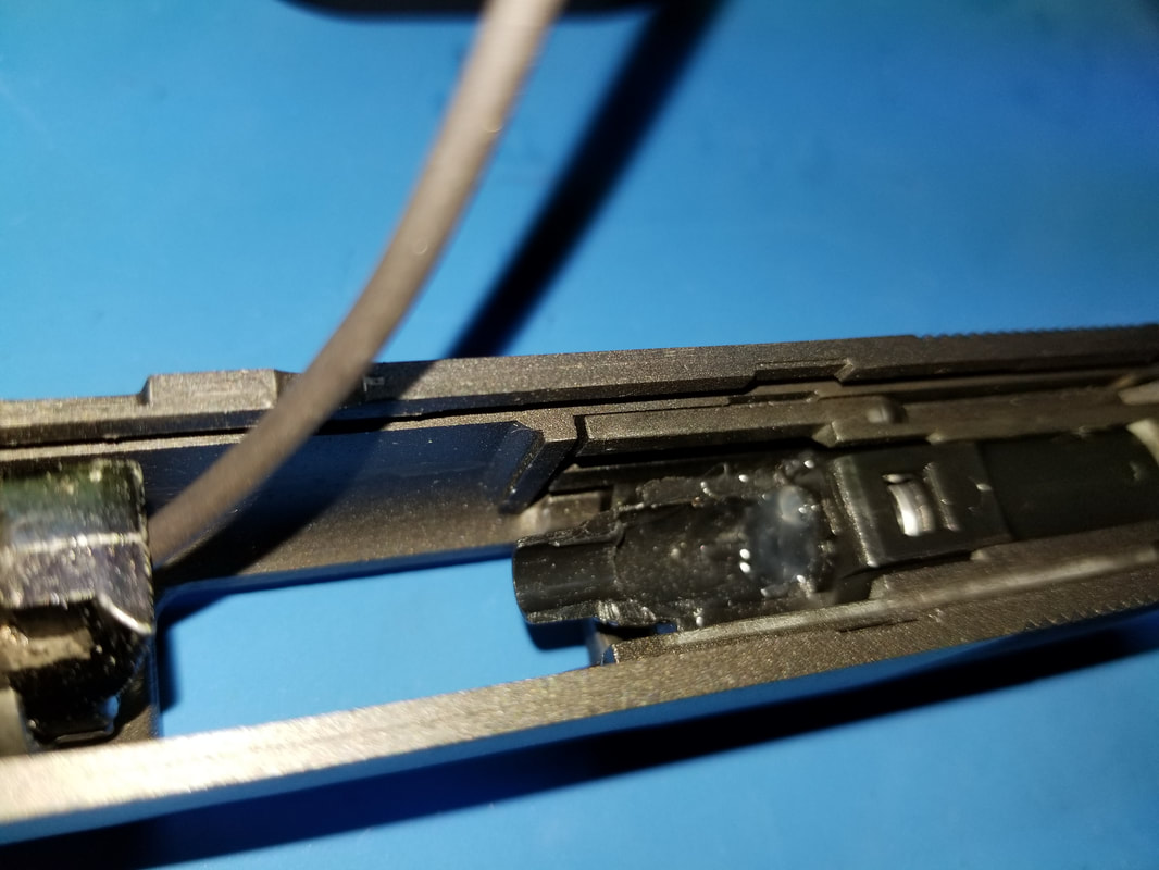 WE DECIDED TO RUN THE TRIGGER SWITCH WIRING STRAIGHT UP FROM THE TRIGGER AND THEN DOWN THE BARREL AND OUT THE FRONT OF THE GUN. THIS ALLOWS EASY CONNECTION TO VR SYSTEM. IN ORDER TO RUN THE CABLE DOWN THE BARREL, WE NEEDED TO BLOCK-OFF THE FORWARD GAS PATH AND REMOVE THE BOTTOM HALF OF THE AIR NOZZLE.