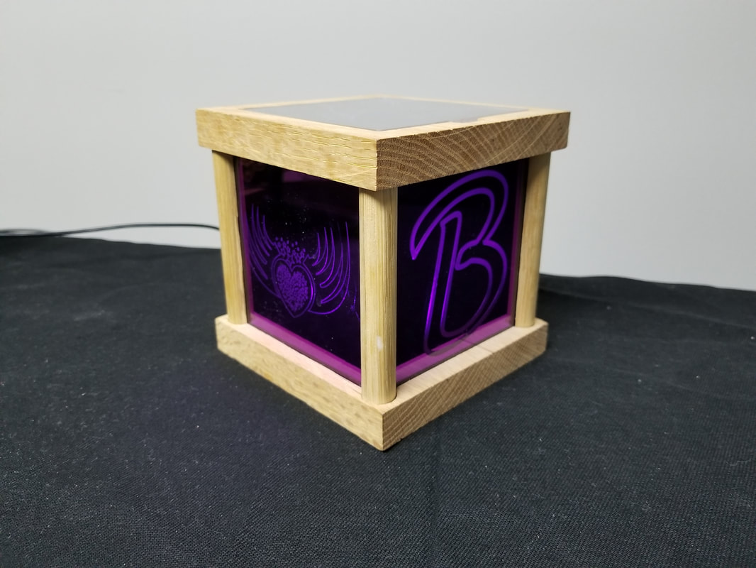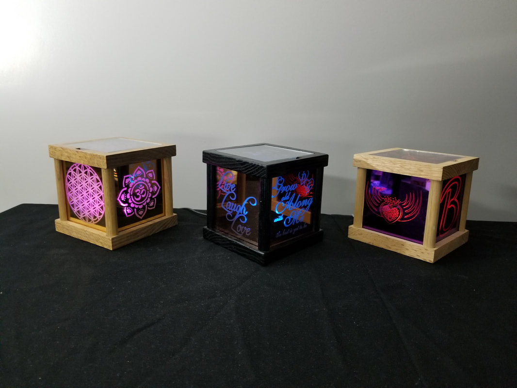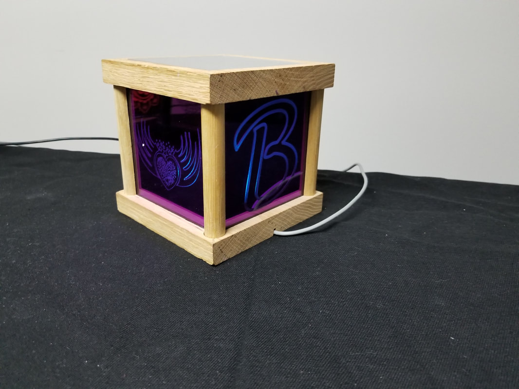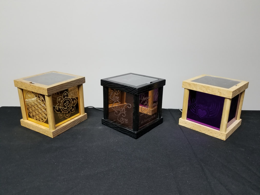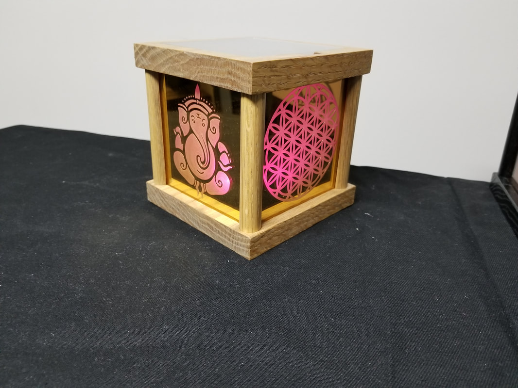 THE SIDE PANELS ARE 4″ X 4″ AND MADE FROM 1/8″ ACRYLIC MIRROR. THERE ARE FOUR PANELS AND EACH PANEL HAS A CUSTOM PATTERN CNC’D/LASERED INTO IT. THE PATTERNS ARE LIT UP FROM THE INSIDE BY THE PROJECTION LED.