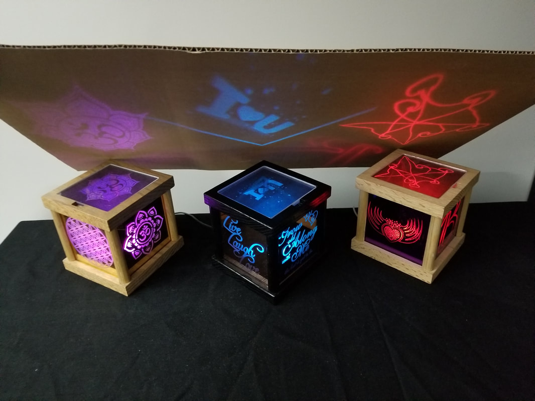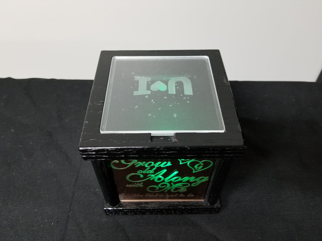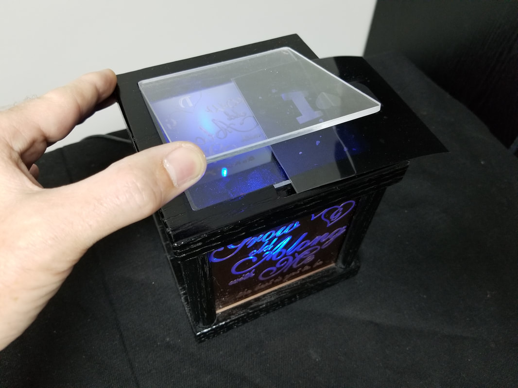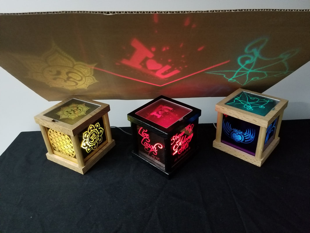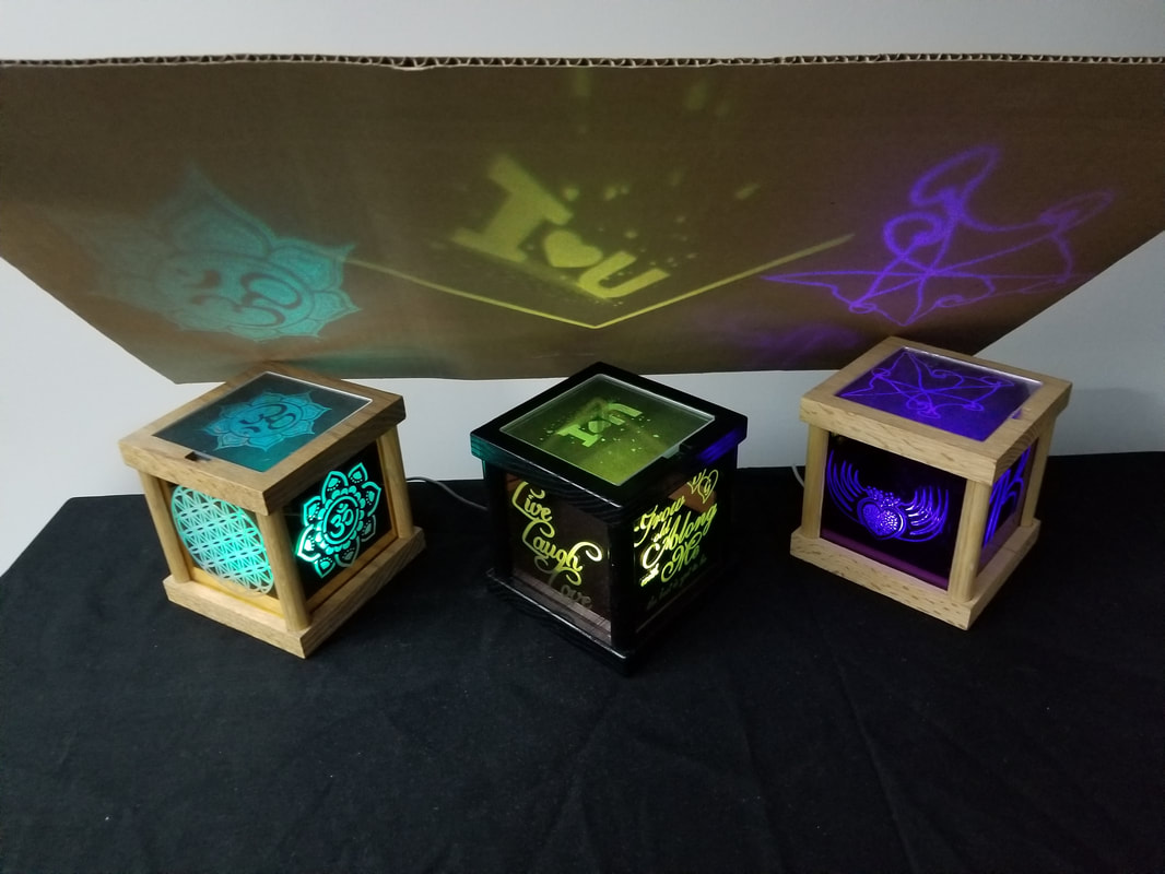 THE SIDE PANELS ARE 4″ X 4″ AND MADE FROM 1/8″ ACRYLIC MIRROR. THERE ARE FOUR PANELS AND EACH PANEL HAS A CUSTOM PATTERN CNC’D/LASERED INTO IT. THE PATTERNS ARE LIT UP FROM THE INSIDE BY THE PROJECTION LED.