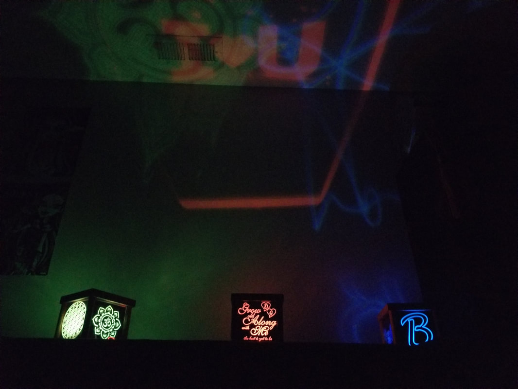THE PROJECTION WINDOW ACCOMMODATES TWO 4″ X 4″ x 1/8″ CLEAR ACRYLIC PANELS. TO CREATE THE PROJECTION PATTERN, A LASER PRINTER OR COPIER IS USED TO PRINT A 4″ X 4″ PATTERN ON TO A LASER PRINTER TRANSPARENCY SHEET. THE PATTERN IS THEN CUT FROM THE SHEET TO MAKE THE SLIDE. THE SLIDE SITS BETWEEN THE ACRYLIC PANELS AND THE PANELS HOLD THE SLIDE IN PLACE. THIS METHOD ALLOWS PROJECTED IMAGES TO BE EASILY CREATED AND CHANGED WHICH IS COOL.