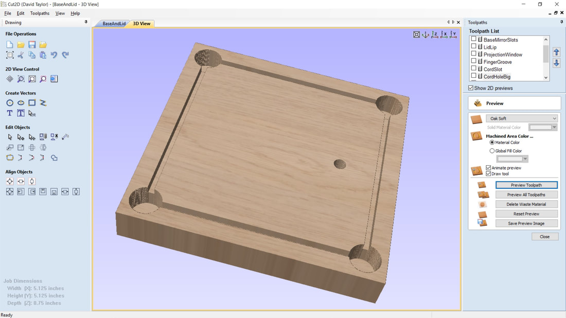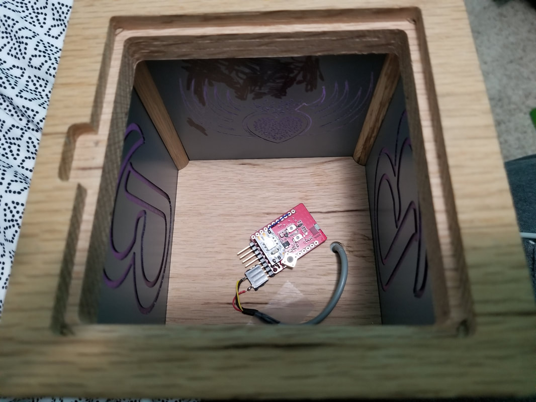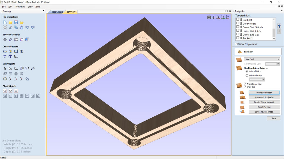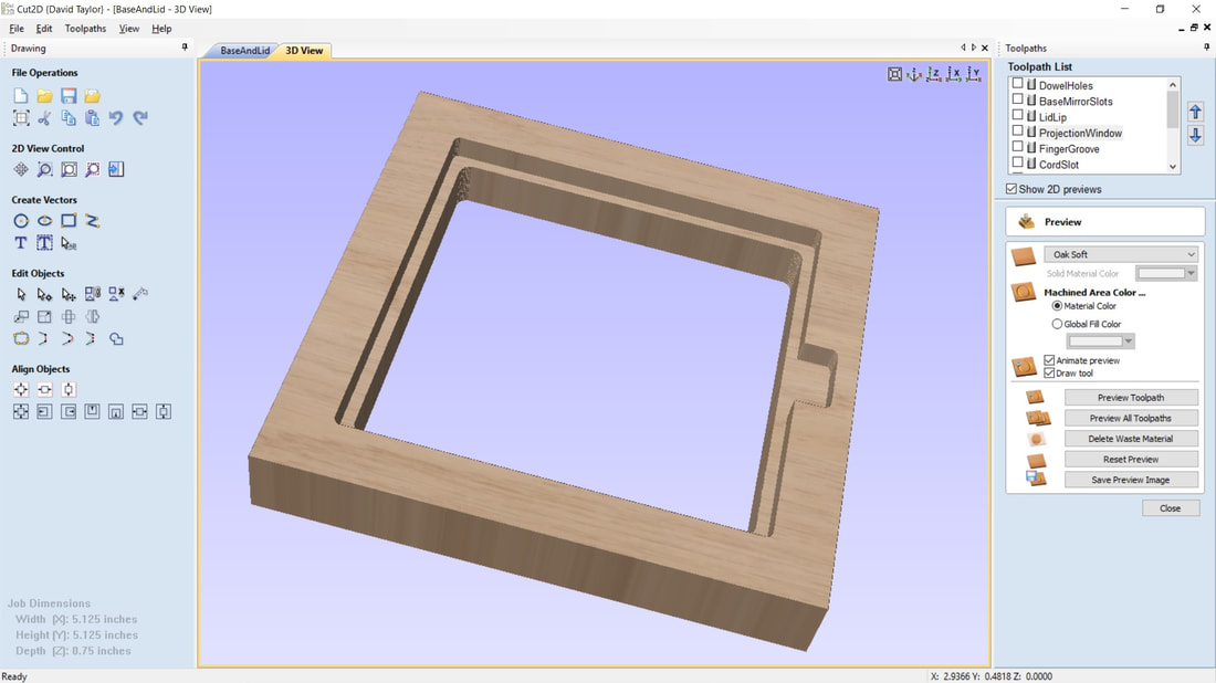 WE MADE THE FRAME OUT OF OAK. IT CONSISTS OF A TOP AND BOTTOM PANEL CONNECTED AT THE CORNERS BY FOUR DOWELS. THE TOP AND BOTTOM PANELS ARE 5″X5″ SECTIONS OF 3/4″ OAK PLANK. THE DOWELS ARE 3/4″ DIAMETER OAK. THE TOP AND BOTTOM HAVE BEEN CNC’D WITH DOWEL POCKETS, SLOTS, AND PROJECTION WINDOW. THE DOWELS HAVE BEEN CNC’D WITH SLOTS.