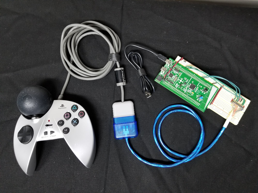 TO CONVERT THE PLAYSTATION PROTOCOL DATA TO USB HID JOYSTICK DATA WE HAVE CHOSEN TO USE THE ST STM32F072 USB MICRO-CONTROLLER.   OUR FIRMWARE IN THIS CONTROLLER READS IN THE PLAYSTATION PROTOCOL DATA, EXTRACTS THE ORB DATA FROM IT, CONVERTS THE ORB DATA INTO USB HID DATA, AND THEN SENDS THE HID DATA TO THE HOST COMPUTER VIA USB.   THE HOST COMPUTER SEES THE UNIT AS A USB JOYSTICK WITH 6 AXES AND 32 BUTTONS.   APPLICATIONS (LIKE ‘DESCENT UNDERGROUND’). CAN USE THE JOYSTICK CONFIGURATION TO ACCESS THE ORB’S AXIS/BUTTON DATA.